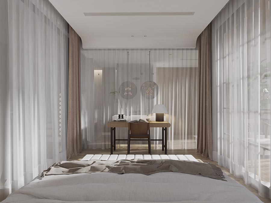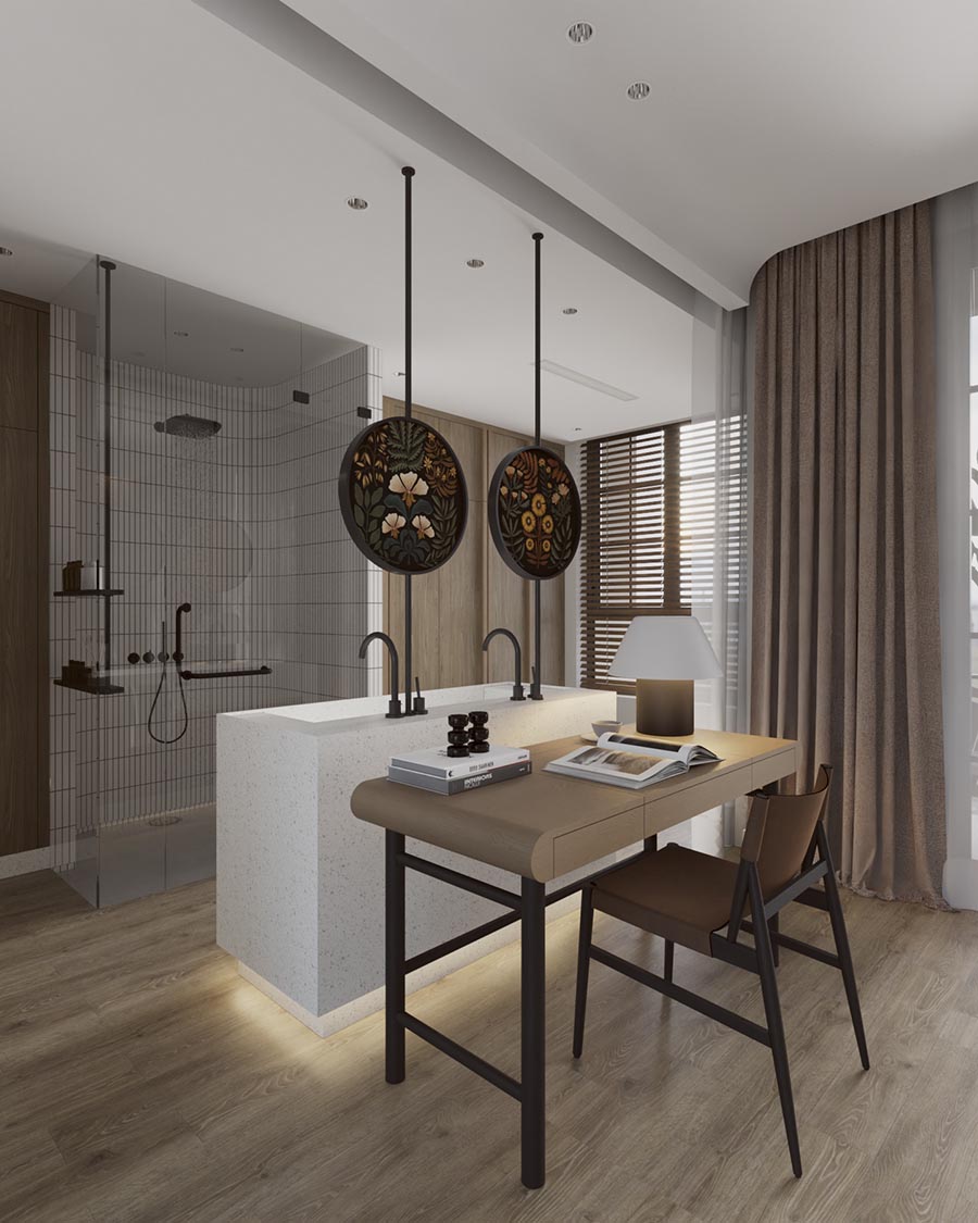 Kiến trúc sư HAY đặt một bàn làm việc giữa giường ngủ và phòng tắm, ngăn cách bởi một lớp rèm mỏng. Một sự phá cách ấn tượng mang đến trải nghiệm thú vị cho nơi nghỉ ngơi của gia chủ.