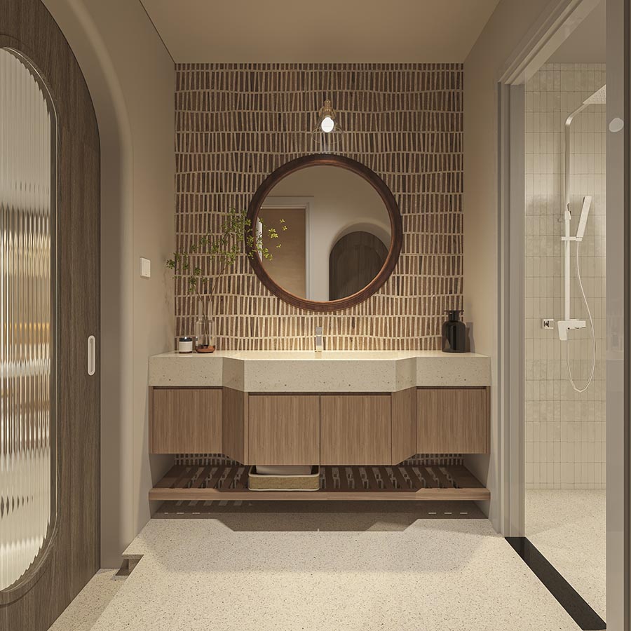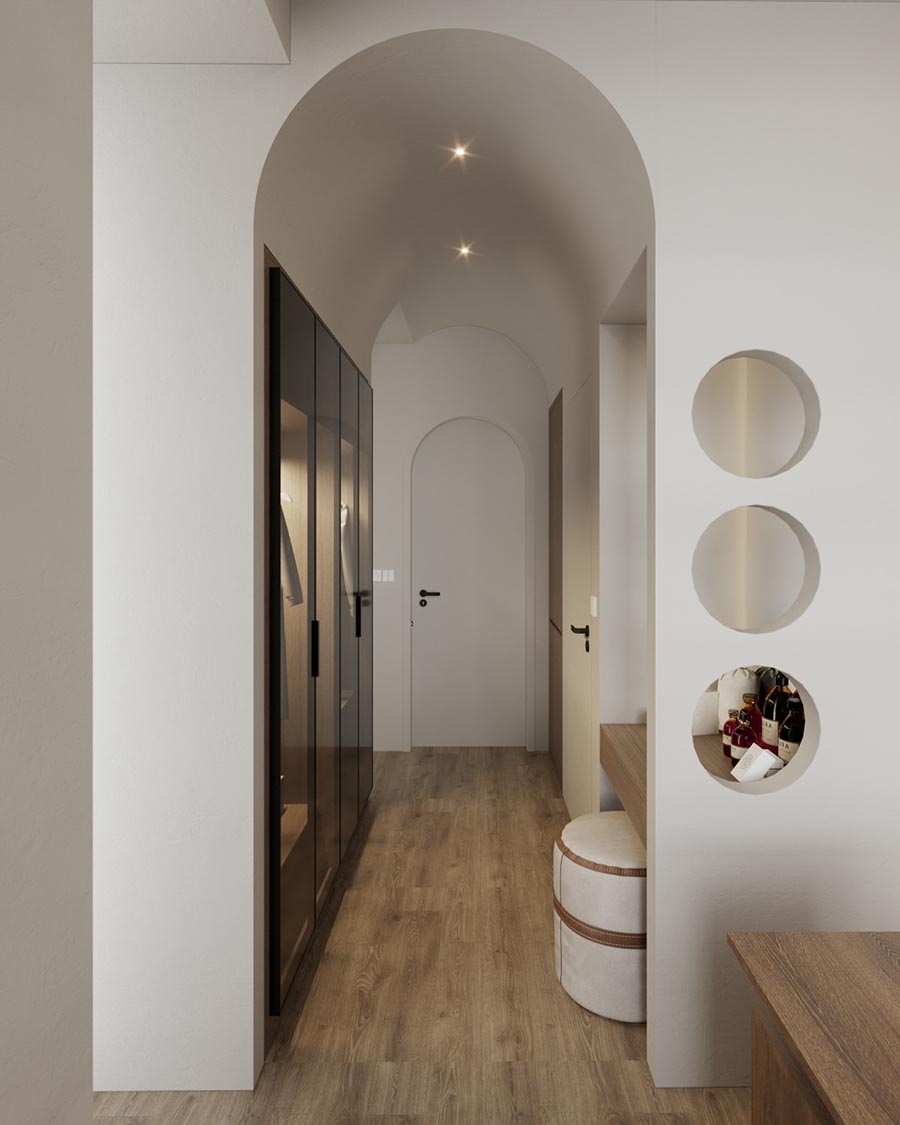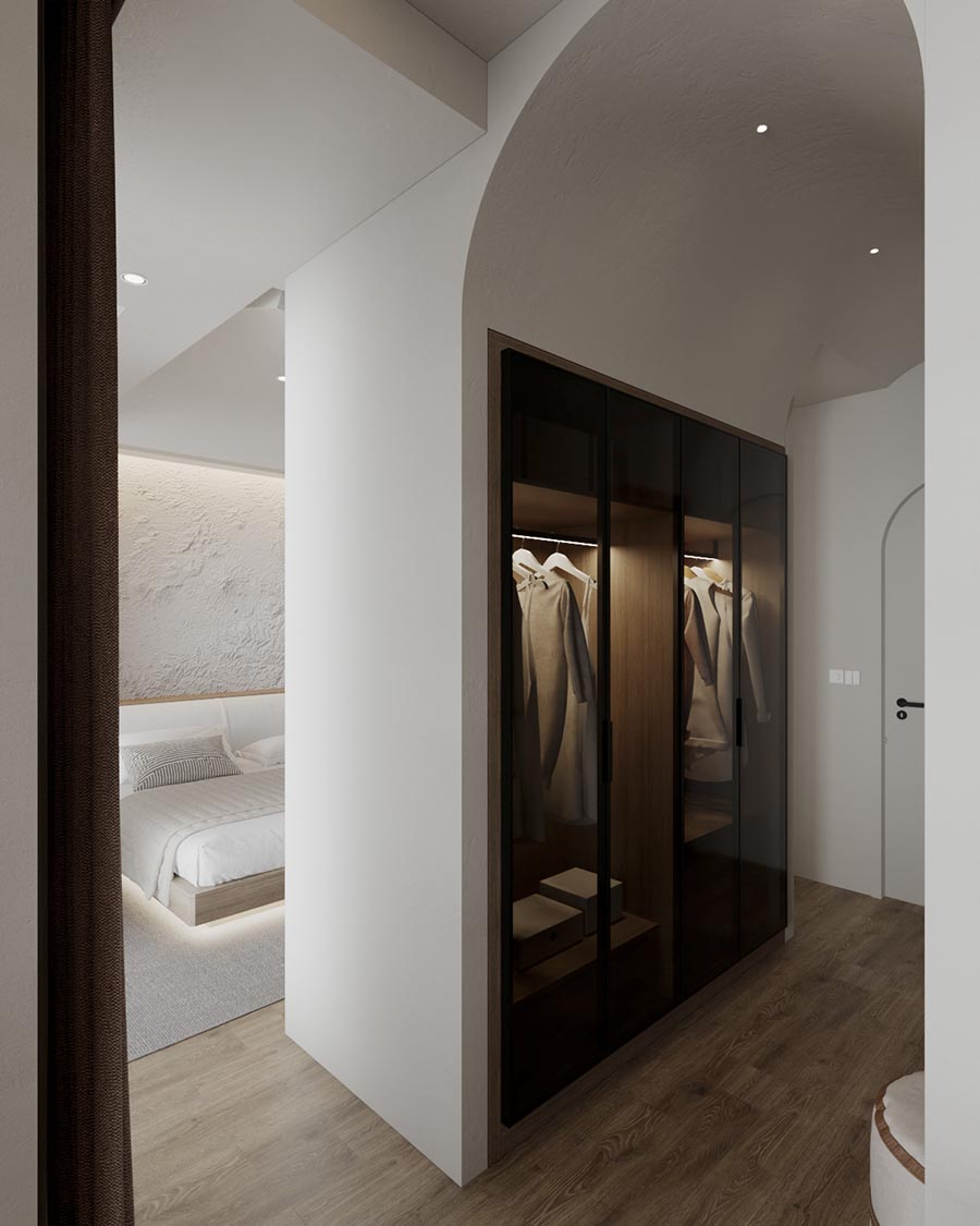 Master room được phân chia thành nhiều khu vực nhỏ với các chức năng như: ngủ, thư giãn, làm việc, phòng tắm. Chúng tôi sử dụng các mái vòm vòng cung để thông các không gian với nhau trong cùng một lối đi.